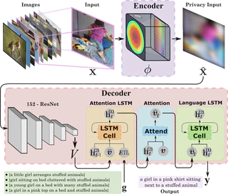 Image caption generation textually summarizes the visual content of an image. This task has gained popularity at the turning point of computer vision (CV) and natural language processing (NLP). Images used to train image captioning models may contain sensitive data that should be confidential, such as faces, personal characteristics, documents, children, etc. This work focuses on protecting privacy in the image captioning task, directly from the image acquisition stage. For this, a refractive lens was designed to ensure privacy using an end-to-end deep learning-based optimization approach. The designed lens blurs sensitive visual attributes in the acquired image while extracting essential features to generate captions even from highly distorted images. The image caption network implements two long short-term memory networks (LSTMs) with an attention module in between to ensure high-quality captions. This method was tested and validated through simulations in the COCO dataset. The results showed a better balance between privacy and usability compared to traditional methods that do not consider privacy.